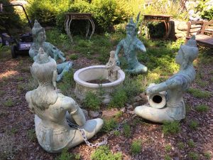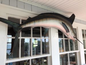 Mounted marlin fish, mounted sailfish, tall wooden carved figure of a woman holding fruit, pair of life size silvered bronze horse sculptures, four spectacular