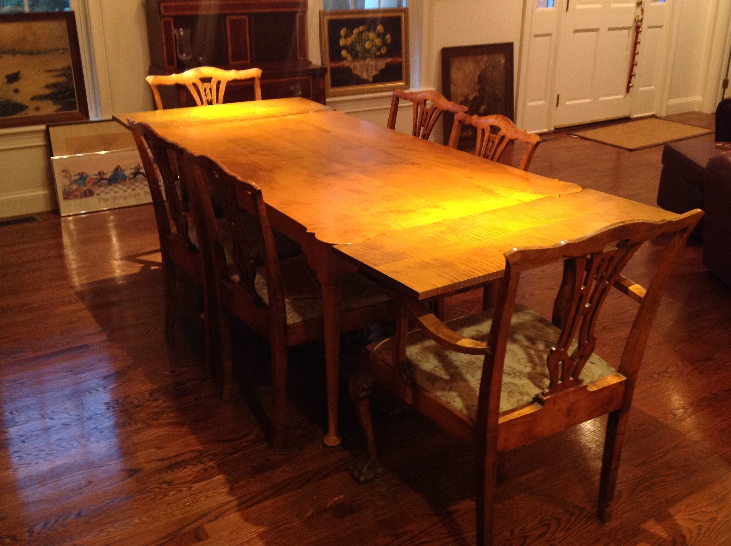 New House Exterior -1 Furniture to include: custom tiger maple dining room table, set of 8 tiger maple Chippendale style dining room chairs, antique walnut marquetry dining room table with 6 Chippendale style chairs, antique Tambour desk, Victorian mahogany and burlwood cylinder desk, pair of Hitchcock chairs, curved glass mahogany china cabinet, Charles Webb queen size bed frame, Charles Webb wall rack, burgundy leather sofa with matching chair and ottoman, Ethan Allen two-piece secretary, bookcases, vintage leaded glass bookcase doors, and more.