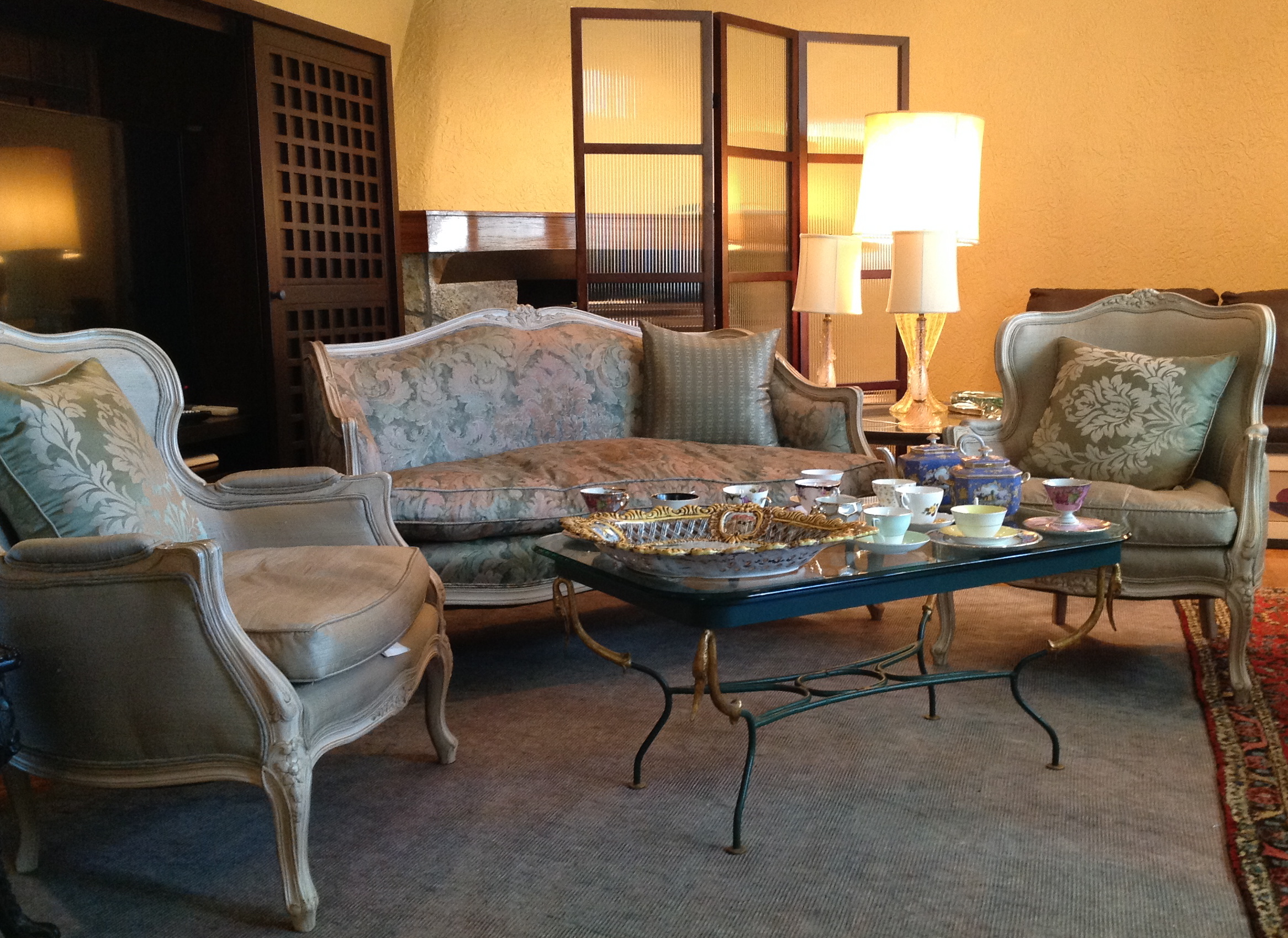 Other furniture to include silk Provincial love seat, silk Provincial chairs, Trouvailles rams-head glass table, Lexington Furniture bombay chest, Italian leather sleep sofa and matching chair, Charles Rogers forged iron scrolled bed, mahogany china cabinet, wrought iron marble top console table.