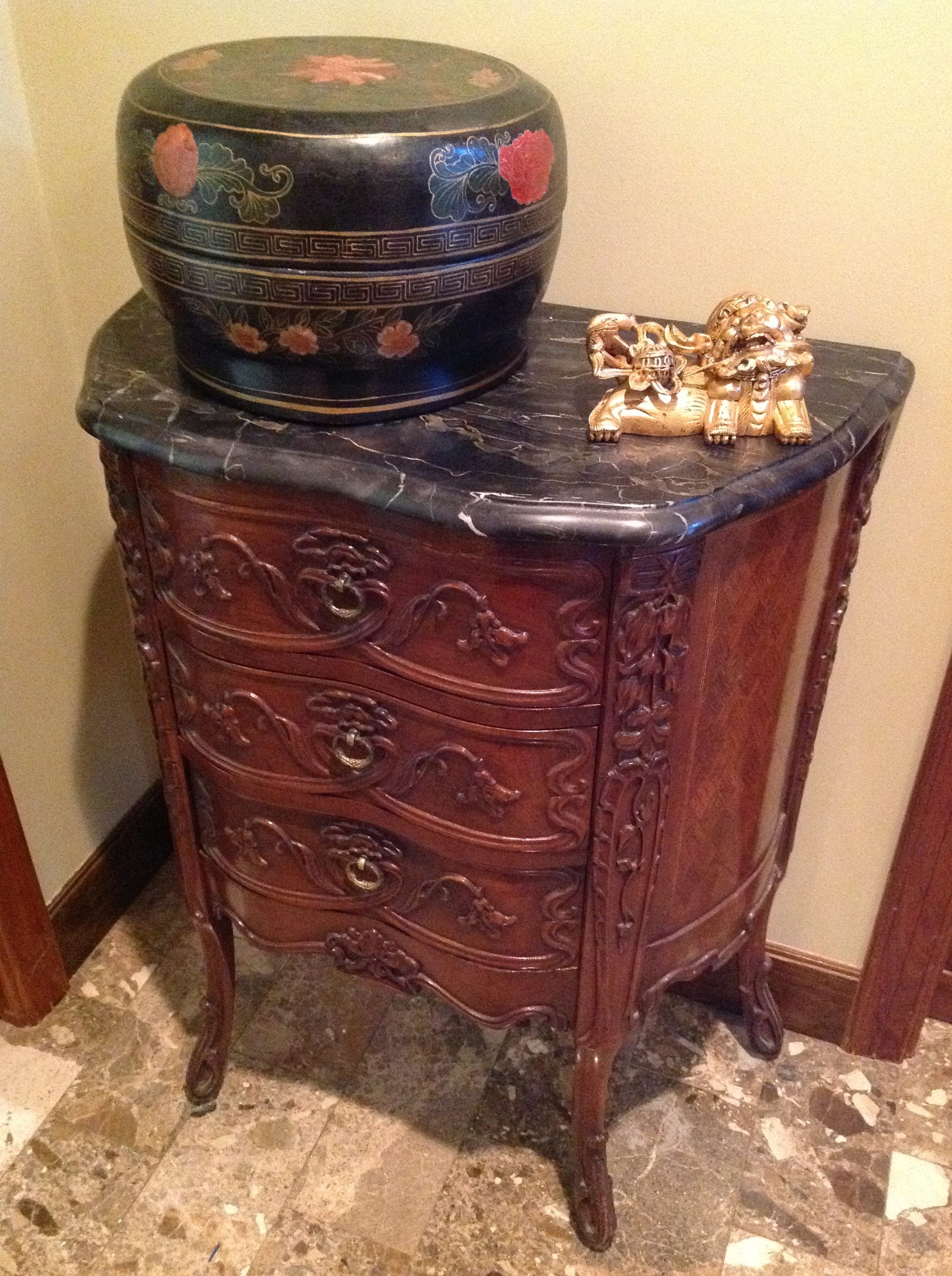 Antique furniture to include French Empire secretary, Empire sewing stand, French style black marble top side chest, French marquetry game table, large Salem mirror, pair Chinese carved marble top stands, French style commode/vitrine, Rosewood corner cabinet, Marquetry inlaid demilune cabinet.