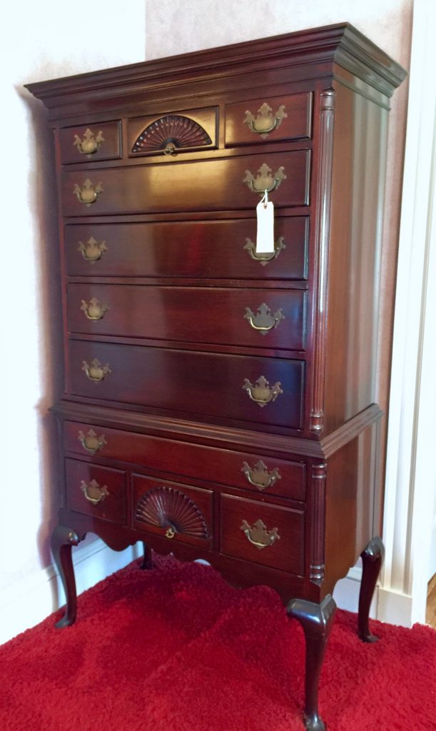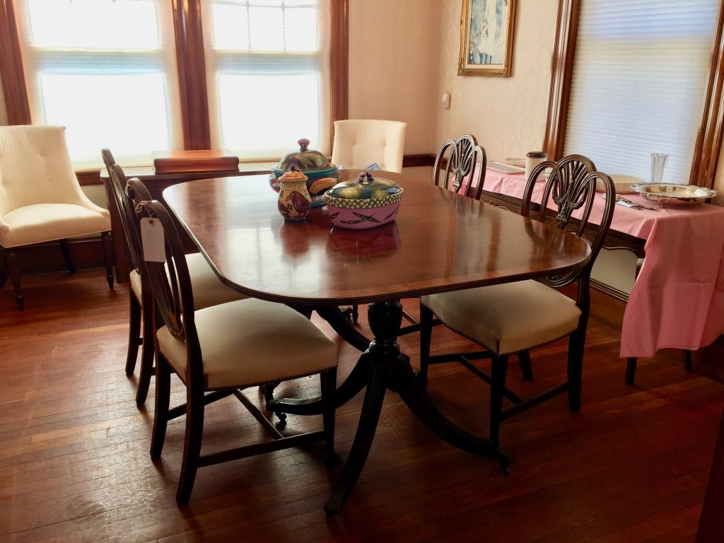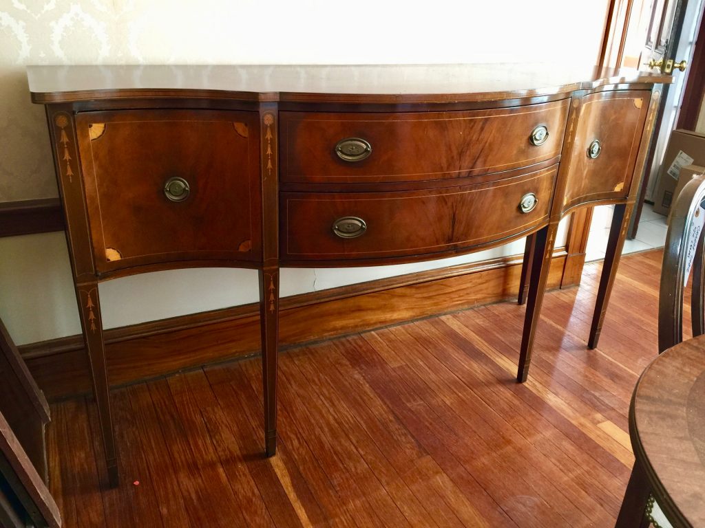 Fine traditional furniture including Charak mahogany inlaid bellflower sideboard, Charak dining room table with six chairs, mahogany carved four poster bed, mahogany chest and nightstand, mahogany highboy,