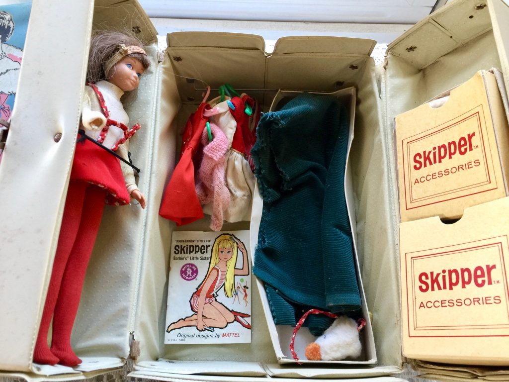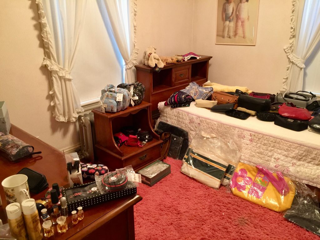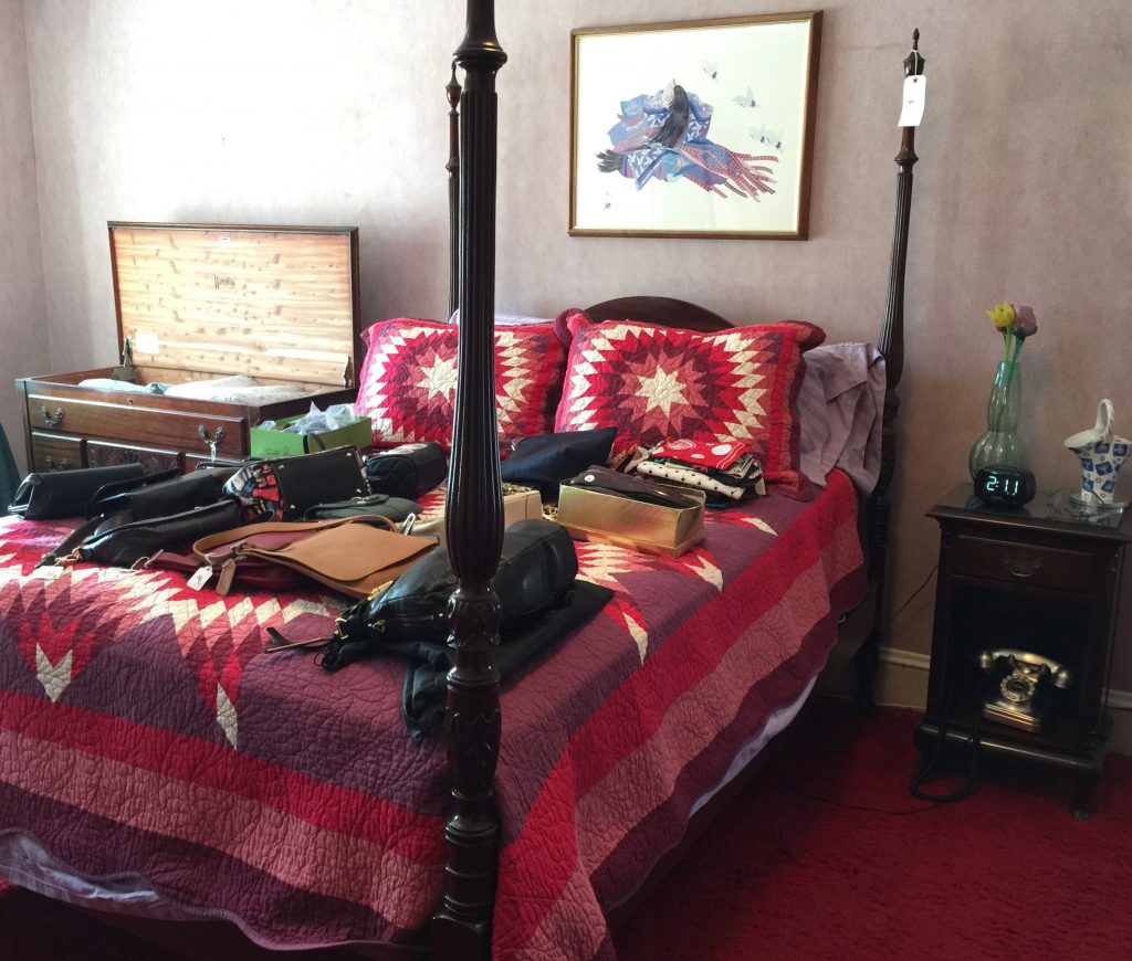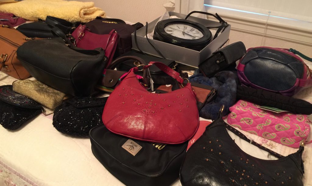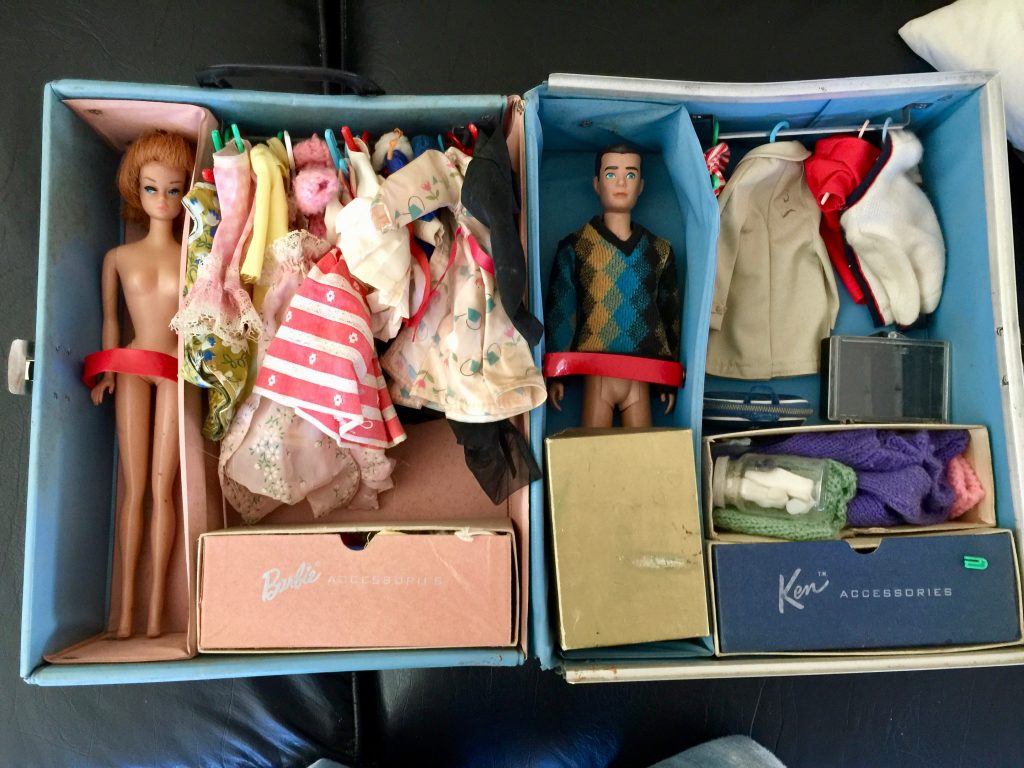 Lots of designer purses such as Coach, Dooney & Bourke, Gucci, Kate Spade, 1980s Marilyn Brooks plastic clock purse, Cole Haan, Moschino, ladies clothing including a Burberry raincoat, lots of ladies shoes, silk scarves, perfume bottles, early 1960s Barbie, Ken, Midge and Skipper with cases and clothing and more!!